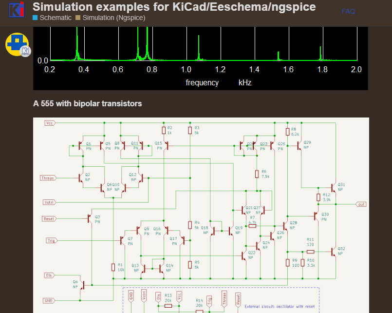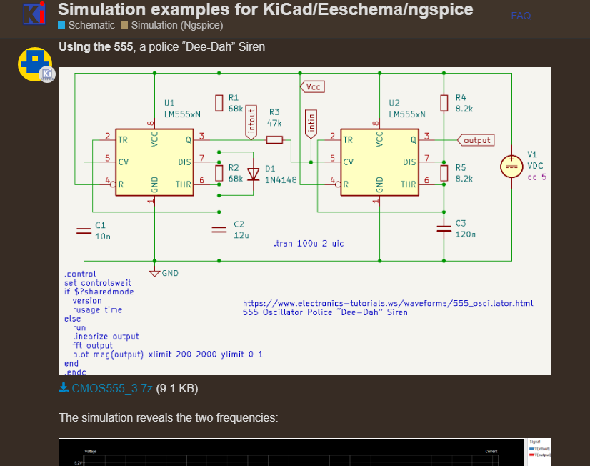 I’ve collected some links to getting started with simulation in KiCad. I think that it also has a working example with an NE555 somewhere in there. And at least it also has links to other resources such as libraries.