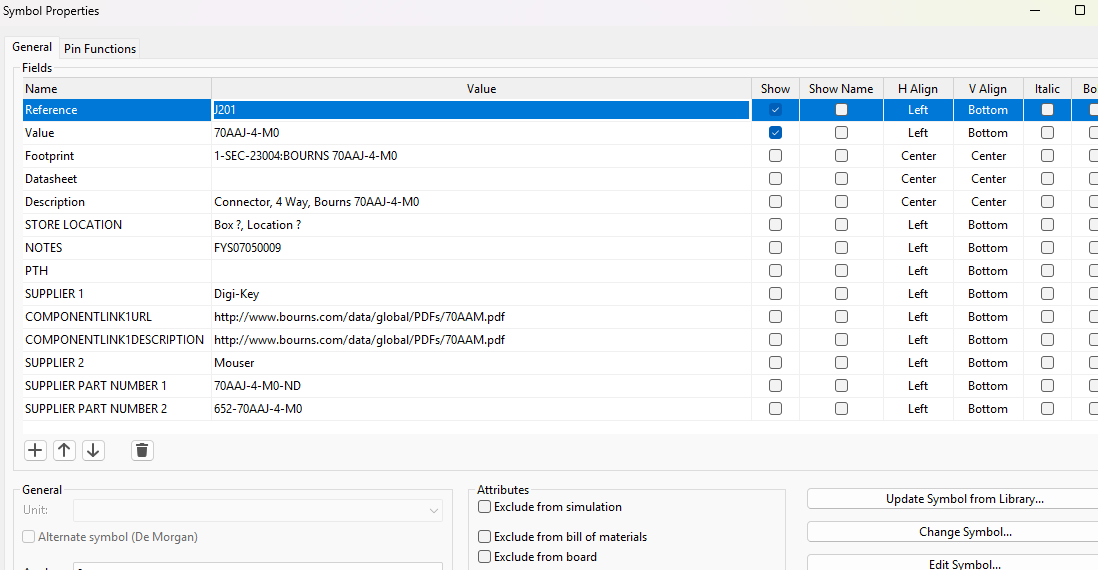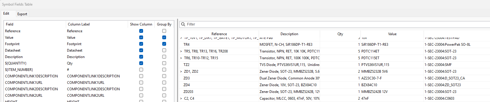 You can also edit these in groups, so if for example you have 20 identical 100k 0603 resistors you can change their properties in one go using the Symbol Fields Table . . .