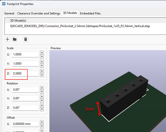 I did found the physical female pin header component at 5mm height in AliExpress, but failed to find any footprint or 3D model that with 5mm height for KiCad, I don’t want to solder myself, just let the PCB manufacturer assembly everthing.