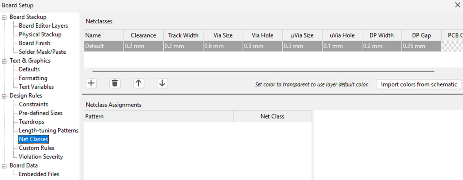 I’m currently working with latest KiCAD version (9.0.5) on a PCB with different copper height on inner and outer layer. Thus, traces on the outer layer (35µ copper) shall be 0.2mm width and 0.2mm clearance (to match device footprints) while on inner layers the limits must be 0.3mm width and 0.3mm clearance (to match production rules).