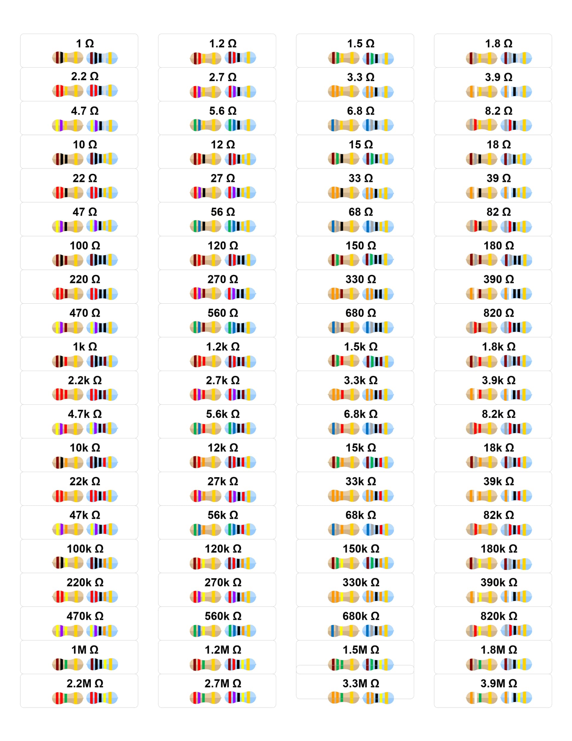 and both 4 and 5 band resistor values with visible resistor bands on the labels.
