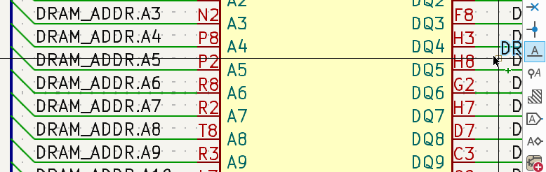 I’m connecting a DRAM in the schematic editor. Many of the connections are to nets unfolded from several buses. I needed to create a local label, so I clicked on the toolbar icon on the right side of the screen. Rather than popping up a dialog box, it created a local label with the name of one of the nets under the toolbar icon: