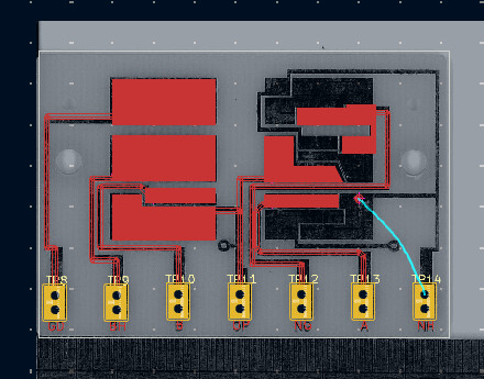 For the “contact area’s” I used rectangles and polygons on the F.CU layer, and I added SMT pads to have placeholders t route the tracks to. Apparently that was not strictly needed, as the center of a filled polygon (on a copper layer) is apparently also an attachment point for tracks. But in that case you do have to set the net name manually.