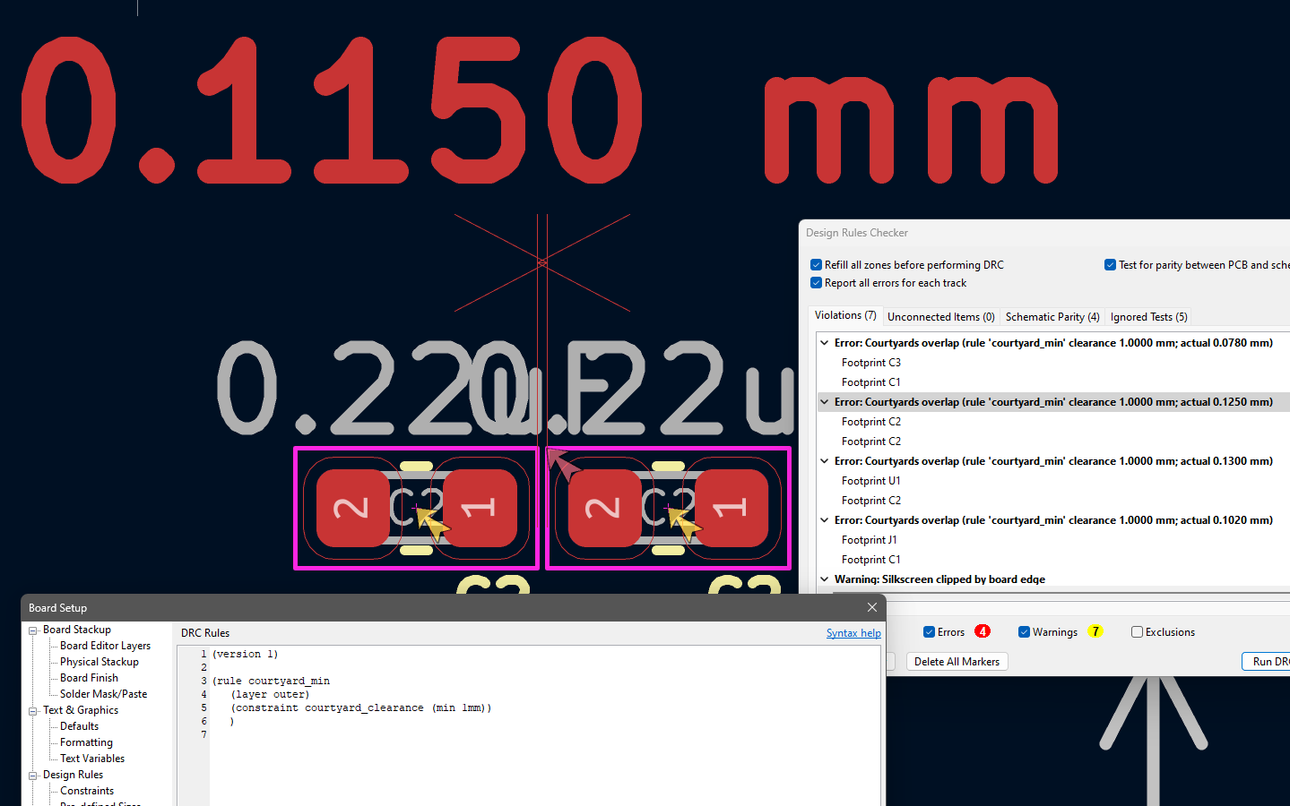 These rules work on themselves. It was just a test, using wildcard in the footprint names is probably better in a real project. Unfortunately this had serious consequences for the interactive router. It blocked most of it’s functions and also created DRC violations. I opened an issue for this on gitlab and the issue was picked up by James J · GitLab and fixed in less then an hour. As a result, this will probably be included in the next bug fix release of KiCad V8.0.5 in a few weeks.
