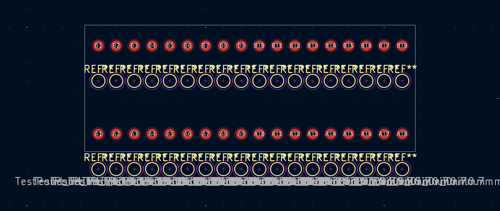 I’ve decided on the board dimensions and laid out 36x 1.5mm pads with 0.7mm holes per the attached screenshot. The bits labelled A1-A18 & B1-B18 are what I’m wanting to see, but I’m also getting a plethora of “REF” labels and the yellow/purple symbols with a “+” in the middle - in addition to the “Test_Point” label at the bottom.