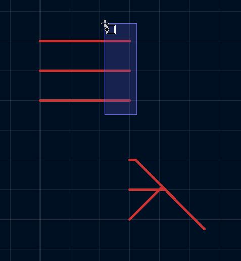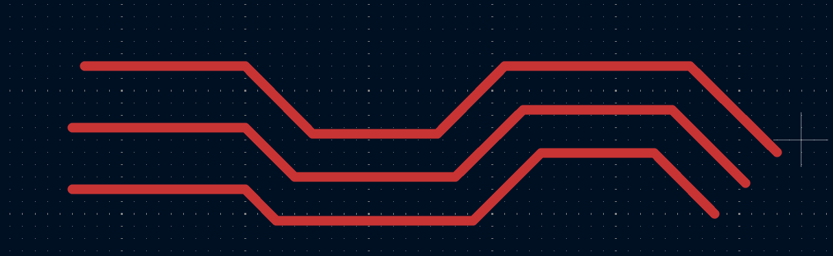 I believe that when dragging tracks, the opposite end of the tracks you want to drag have to be fixed to another object. In version 9.04 (Windows 11, 24H2), when I try to drag the ends of free tracks as shown in the previous 3-track example they go all crazy. But when I add a 45 degree small track to each track, one at a time, then drag the added tracks after selecting them - they drag nicely. In the example below, I added the small 45 degree tracks to the horizontal tracks on the left side of the image. I then highlighted the 3 added tracks, and dragged only one of the tracks to get the routing towards the right.