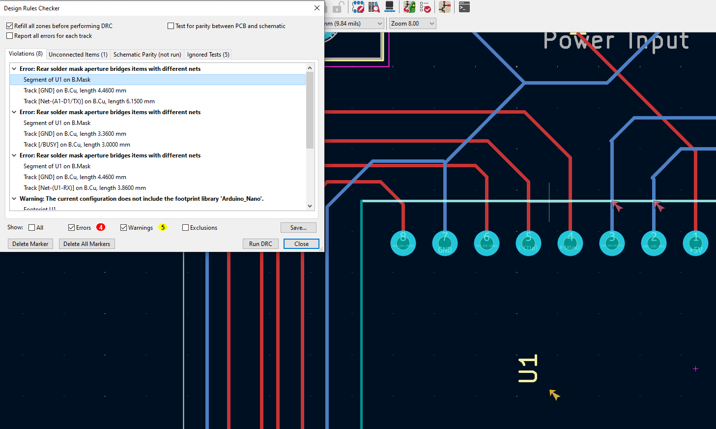 I’m new to KiCad and designing a PCB. When i run the design rules checker, it gives me the error “Rear solder mask aperature bridges items with different nets”. I’m not sure I know what this means or how I’m bridging those connections. The routes are all separate. It calls out a segment of the footprint (U1), which is weird. Is it saying the edge of the footprint is connecting my other routes (nets)? Thanks for any assistance.