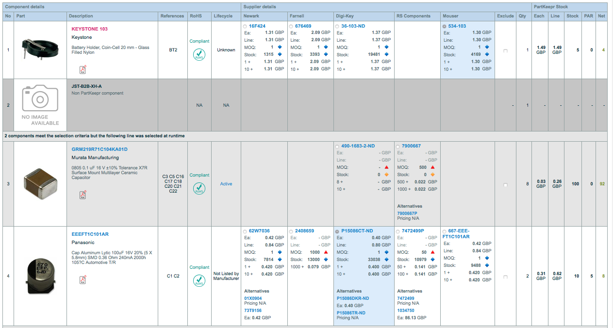 I linked this to access the Octopart API to pull in stocks and costs for a variety of suppliers. After a few months the API changed very significantly and I was just about to get around to a rewrite when my access token was pulled and Octopart refused to answer my emails.