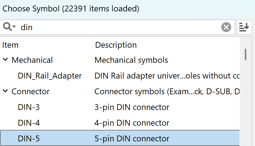 I recently installed KiCad 9.0.6 and have started using it to create a schematic/pcb for a project of mine. One thing I’ve run into a few times is not being able to find a component in the libraries. In this case it’s a 5 pin DIN jack, but there have been others.