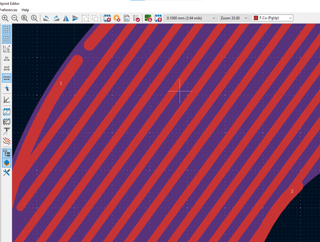Now I have designed the footprint as spirals of two different nets, i.e., 1 and 2. I placed one pad for connection 1 and a second pad for connection 2.