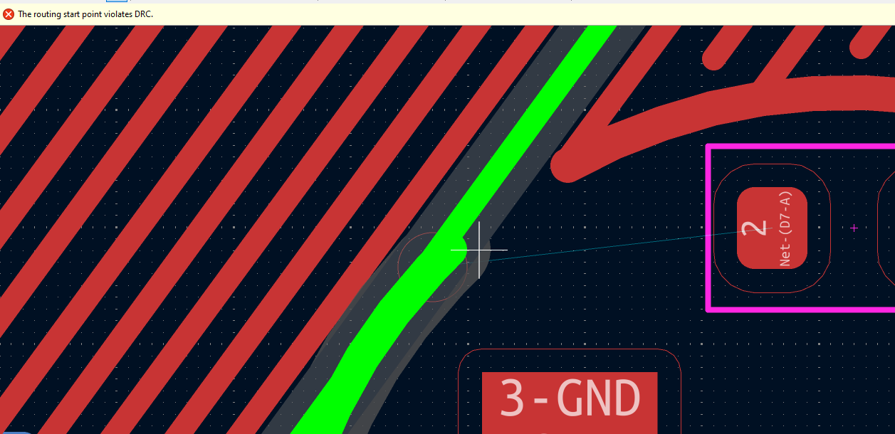 A) I am unable to take any route from the pad of this custom footprint that I have created. If I try to take one, the pad becomes green and says âDRC Violation.â