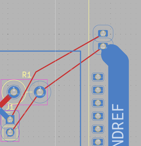 Provided that you have Interactive Router set to ‘Highlight collisions’ mode. If you set it to ‘Shove’ KiCad will not allow to go with track over such pad and you will not have it being green.