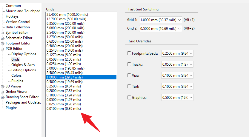 I’m currently using Kicad 9 and have encountered an issue with the display of measurement units related to grids; they are not matching in PCB Edit. Is there a way to fix this?
