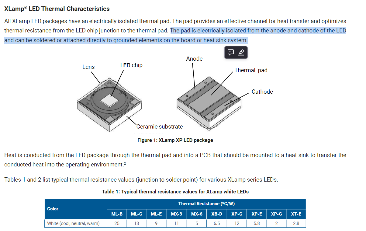 My point is that if the heatsink pad is isolated, that means that you could connect it to either cathode or anode (if it is convenient for you to do so) without hurting anything. But I am only 95% certain and I recommend testing one LED before you commit your pcb layout to this.