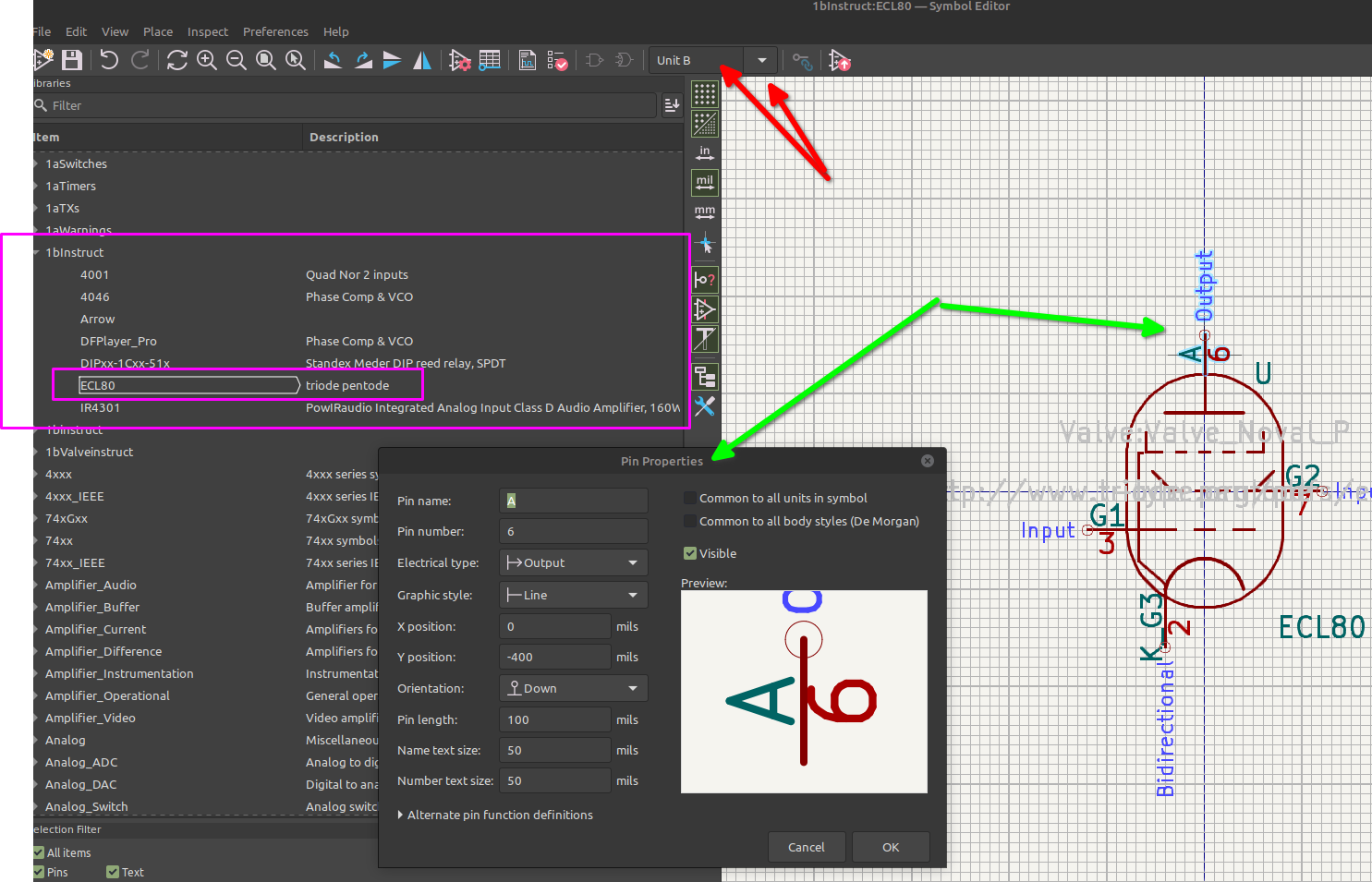 However, downloading the Symbol zip for ECF80 and importing (seems I have to create a new Library as can’t add it to “valve”) it only shows the Pentode part and won’t let me create part A and Part B for the valve. If I try, it throws up an error and shuts KiCAD.