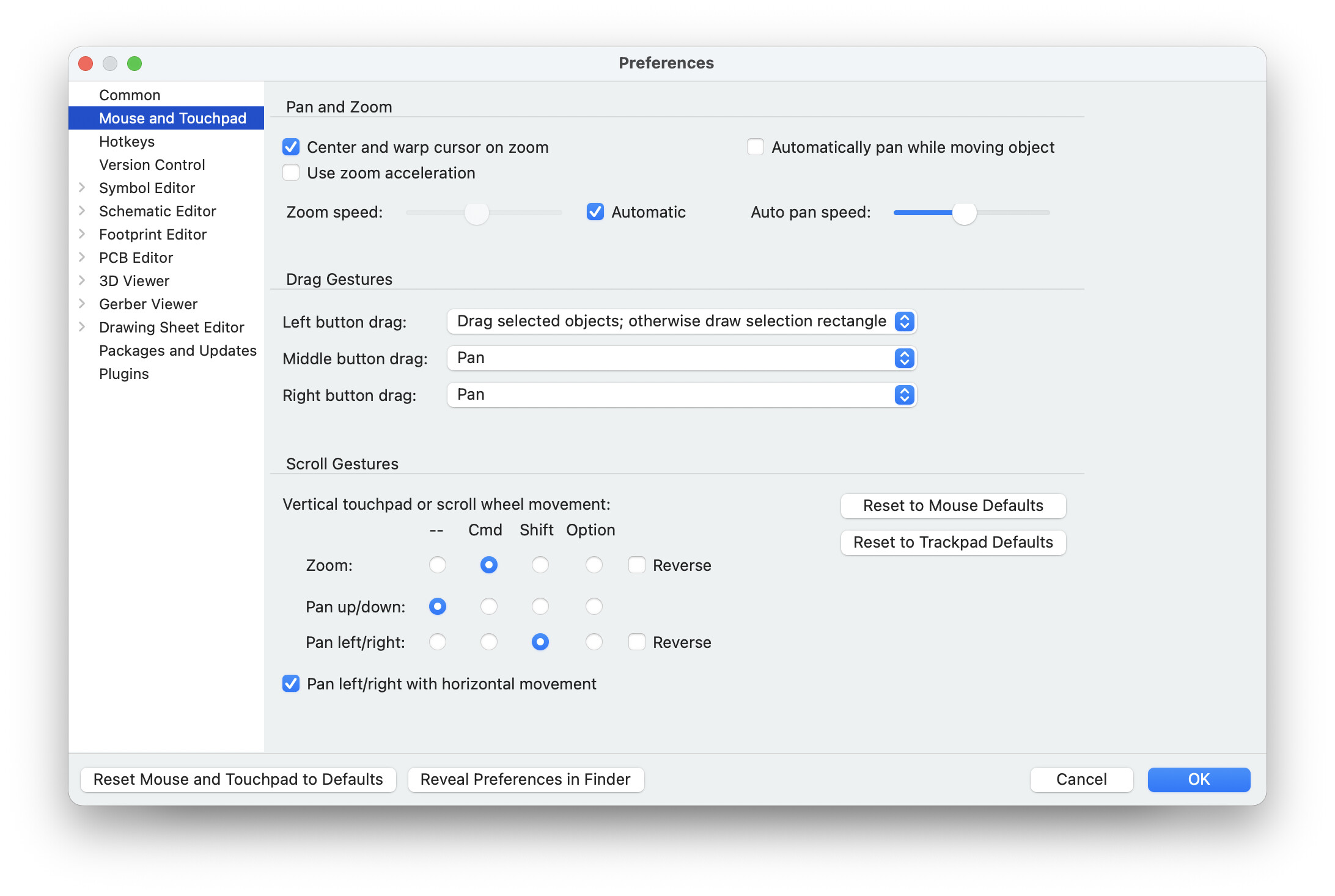 Iām glad you found v8 satisfactory. In case it helps, there was a moment in time when KiCadās mouse/trackpad panning suddenly became really, really good on macOS, and Iāve never looked back. Hereās my current settings. I think from memory the key is the āhorizontal movementā setting - I never use the modifier keys. I now exclusively pan with the Magic Mouse or trackpad, and zoom in and out with hotkeys assigned to ā1ā and ā2ā.