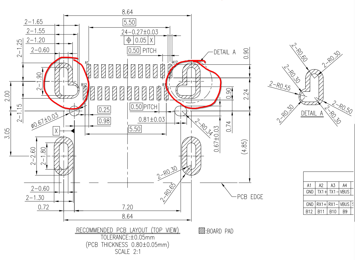 I have here a USB-C receptacle which according to the drawing requires L-shaped through holes. I write this post to discuss the process of making such a footprint and to get a better search result in case others stumble on the same challenge.