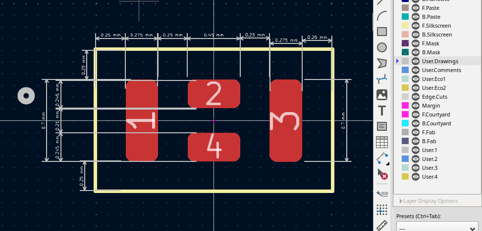 The idea was add dimensions of pads and their spacing and the spacing between pads and the courtyard as per instructions in the link above. When I selected the measurements icon on right, it is not showing the hidden measurement tools and they are locked. There appear to be 3 or 4 other measurement tools which open after clicking on the arrow symbol. They had appeared twice after which they had disappeared. Left clicking on the measurement icon opens only one type of measurement tool that is same as with pressing CTRL-SHIFT-H on keyboard.
