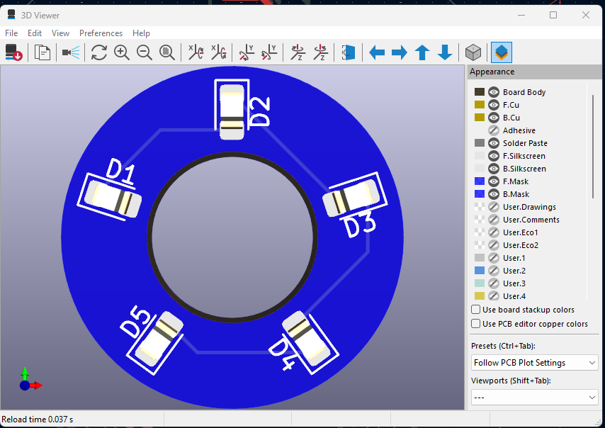 So the red silkscreen is orange, sicce the overlay isn’t rendered the same.This is a bit disappointing since technically GLTF supports everything in the 3d viewer so its should accomplish this but alas different engines support different shading. Now we can change the color of the copper and have somewhat close to what the 3d viewer has but that’s a trick.