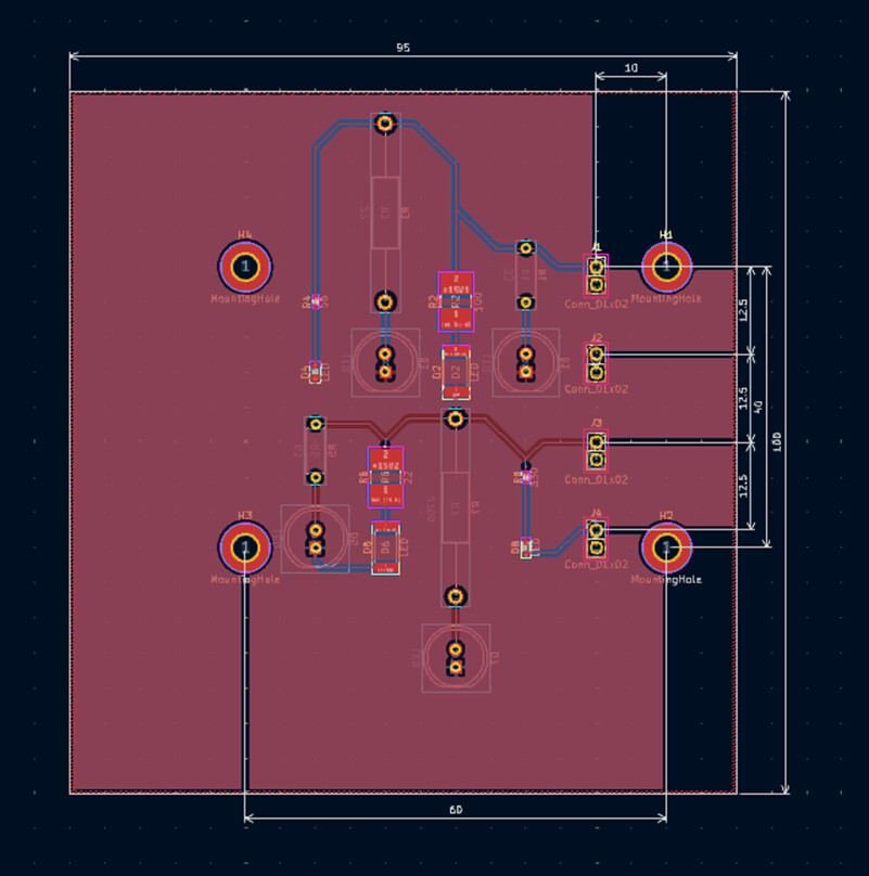 Next, for the dummy LED board the overall dimension is 96mm X 100mm. I copied the alignment of the mounting holes and the jumpers (jumpers being on the top layer this time) exactly onto this board and the job became simple.