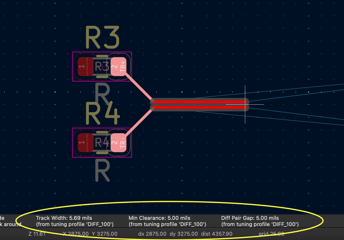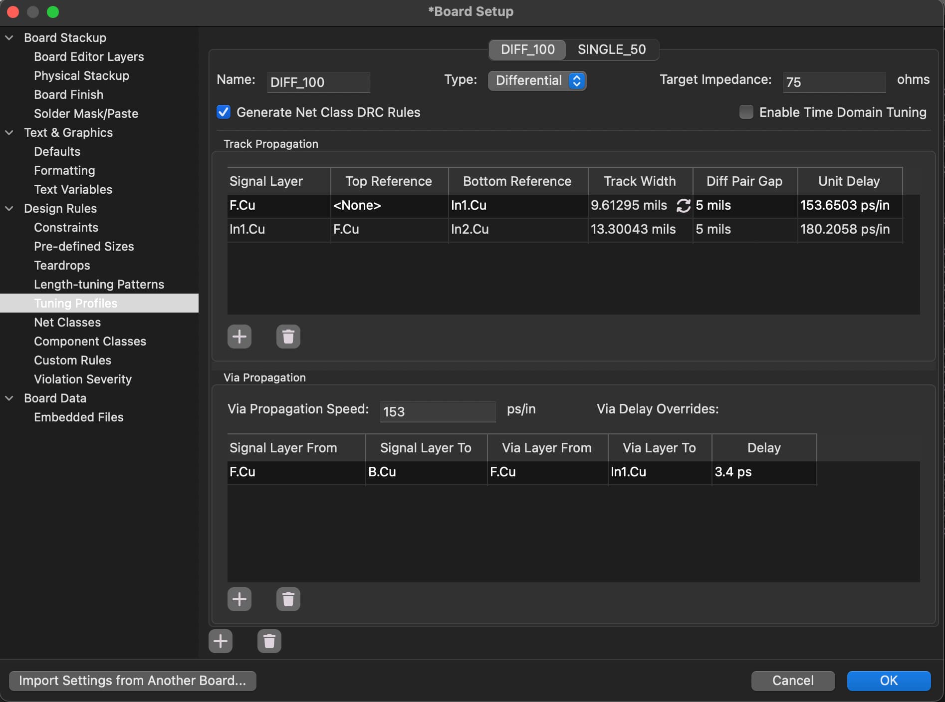 There are two configurable options for each Tuning Profile - Generate Net Class DRC Rules and Enable Time Domain Tuning. If Generate Net Class DRC Rules is selected, width / diff pair gap rules are automatically generated, for use when routing across multiple layers requiring different geometries: