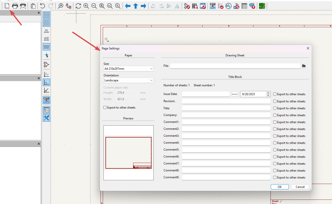 It seems incredible that a fabulous software such KiCad does not allow to set the size of our drawing at the beginning. We must be able to resize ! Suppose we draw a poor 555 with a blinking led or a whole complex motherboard ! Our poor 555 will seem lost in the center of the A4 page !