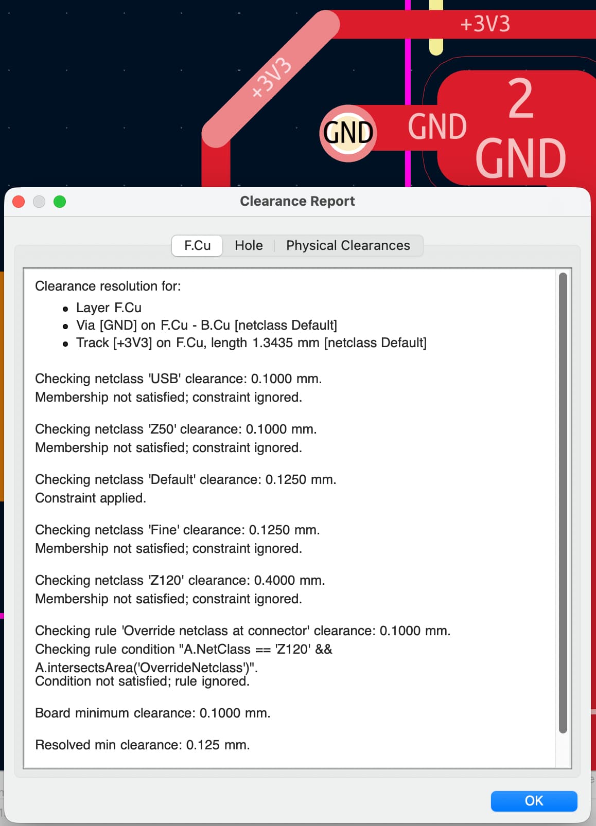 For example if I run it on this track and via, I can see all the constraints and why they do or do not apply, and what the final constraint is that is applied. The constraints checked include the global constraints you mention, plus the netclasses, plus custom design rules I’ve set.