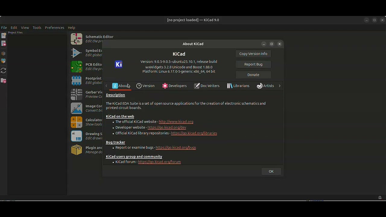 Running on a stock Ubuntu 25.10 with Gnome. At the end of the post you can find the version string from the About dialog. Next to mouse issues, there is also a rendering problem as pointed out earlier. At some point the redraw/update of widgets and canvases doesnt work anymore. This also happens with standard wxWidgets widgets, i.e. in the project manager. When it is in that state, you can still interact with Widgets as also described earlier. I.e. in the about dialog you can clock buttons but the GUI simply doesnt render the resulting appearance.