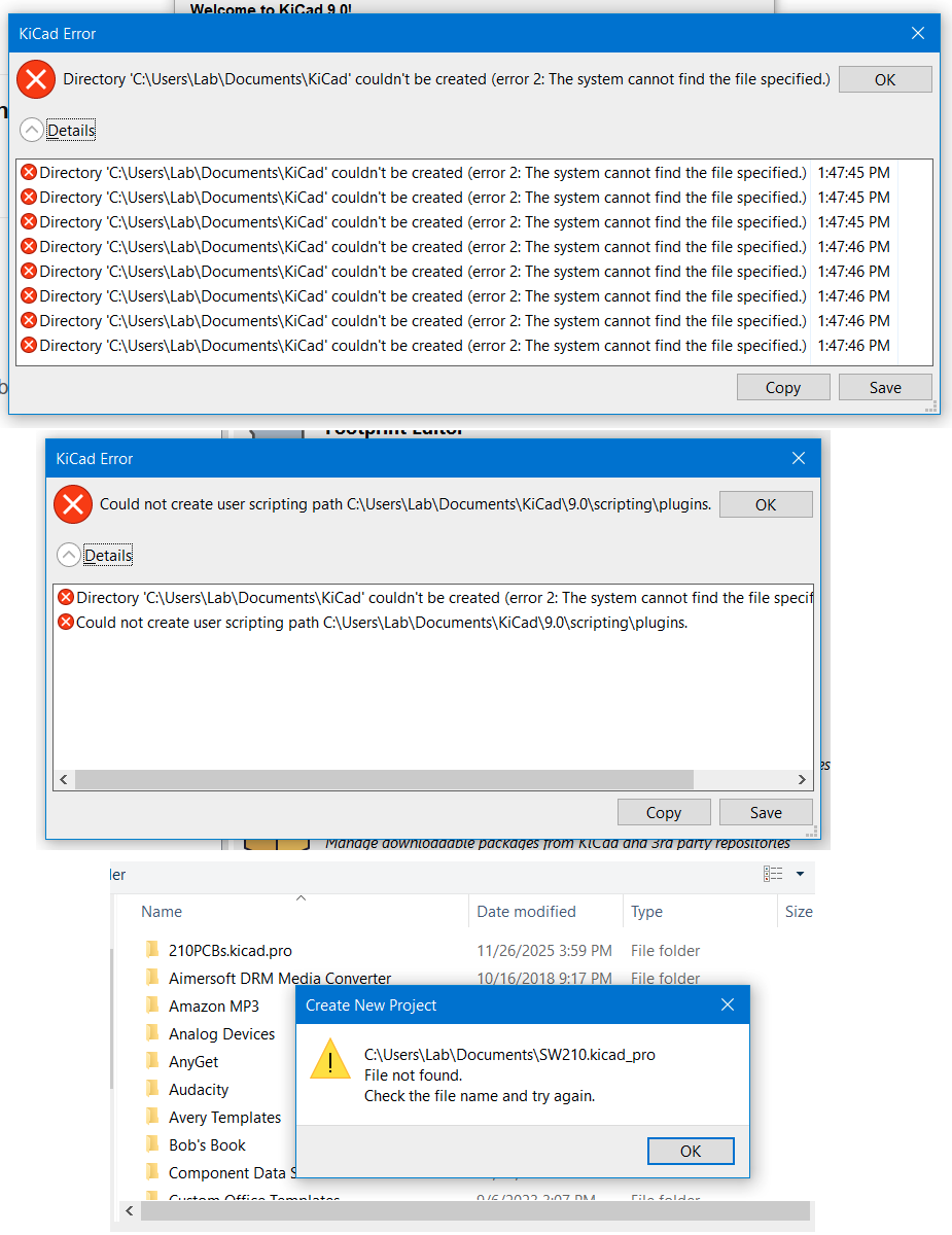 Just introduced to KiCAD, no experience using it yet because of installation errors. I’ve downloaded it a couple of times, from two different servers, but during installation I get a raft of error messages about the installer not being able to create a file, because “the file can’t be found.” It’s as though the installer is looking for folders created previous to the installation process. Once the (incomplete) installation finishes, neither the Schematic or PCB Layout workspaces will open. I click and nothing happens. The Gerber viewer will open, and looks like a really good one, but I can’t start a board design. I must be doing something wrong, or my computer senses a threat and is refusing certain instructions, but no idea of what to look for.