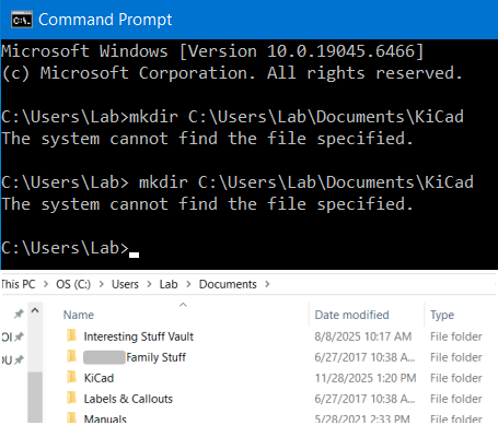So just like the error messages I got during the several failed KiCad installations, a mkdir command, either typed into Run or from a program installer, isn’t able to create a specified folder because that folder can’t be found. This does not make sense to me at all.