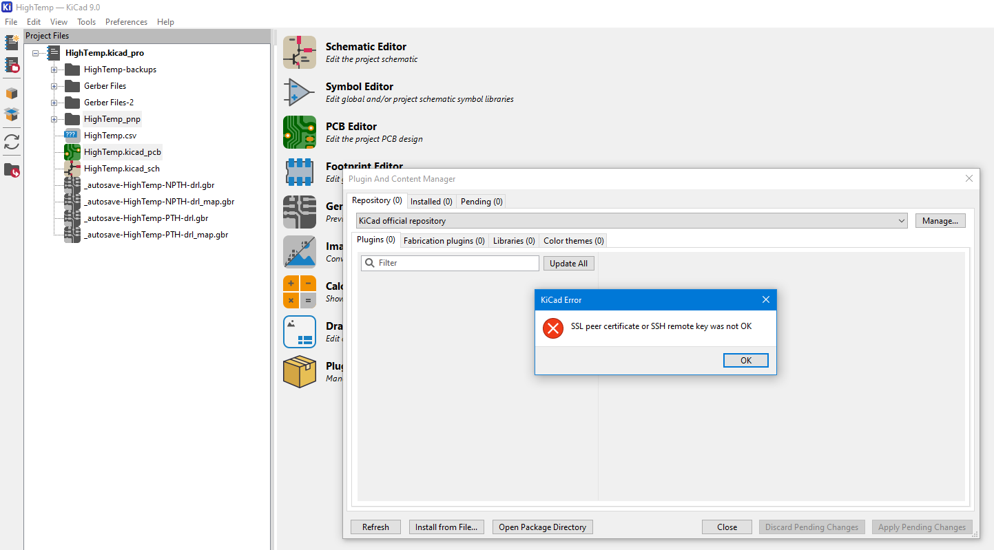 when i click onto my Pluins (Kicad plugins), I get this error: “SSL Peer Certificate or SSH remote key was not ok”. Any idea why I am unable to activate plugin ? Thanks